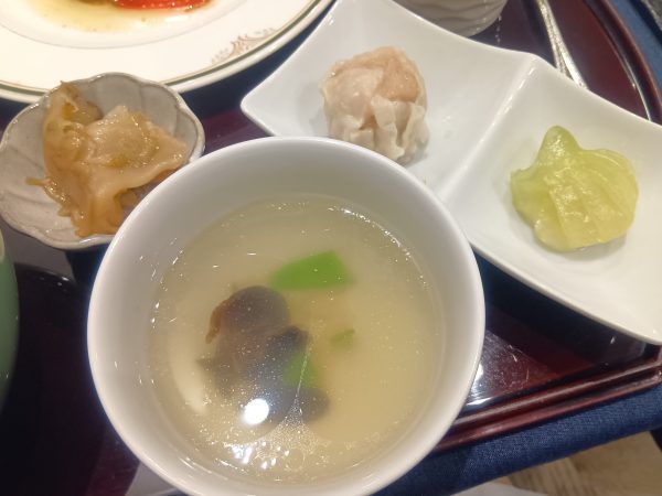 ★点心2種 ★中華スープ ★搾菜 点心は焼売と餃子。どちらも柔らかで、肉汁ジューシー。特に餃子はモチモチで、もう一つ食べたいくらい美味。中華スープと搾菜も安定の美味しさ。