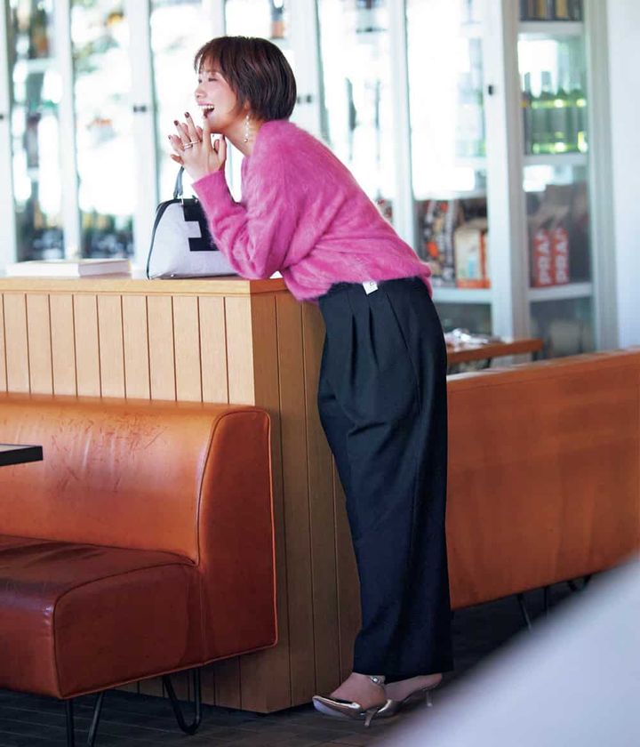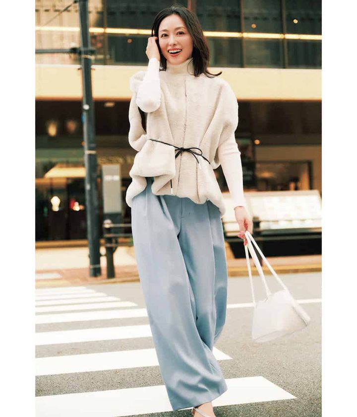 柔らかな雰囲気に寄り添うのは、ホワイトのワイドパンツ。落ち感のあるシルエットが、ふわふわニットの甘さを程よく受け止め、縦ラインを強調して自然にスタイルアップ。多幸感のある素材とカラーのトップスも、クリーンなパンツ合わせで大人バランスに着地します。