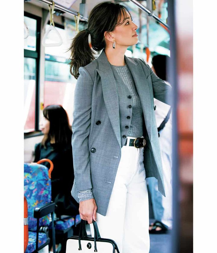 白デニムをジャケットで通勤コーデにシフトさせた、コーデがランクイン!白黒でパキッとしたモノトーンよりも、白×グレーのほうが優しげな印象に。色合わせも人気の理由のひとつです。