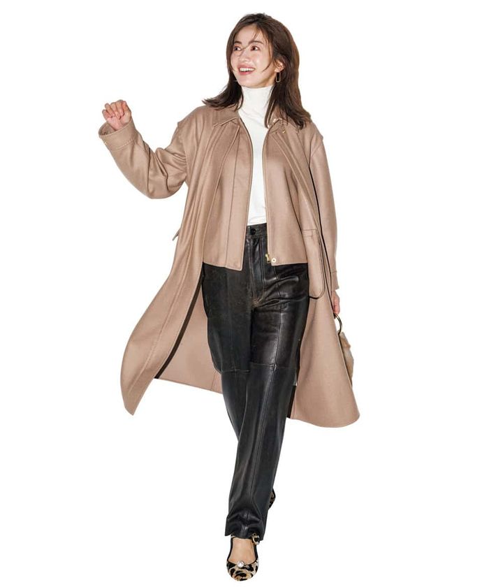 モードなレザーパンツのスタイリング。ベージュのコートを合わせることで、マイルドな印象になっています。レザーボトムスなのにハードすぎず、どこか甘さがある雰囲気がSTORY読者のハートを掴んだ様子!