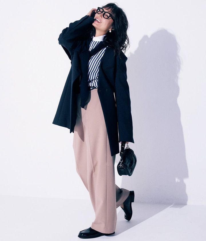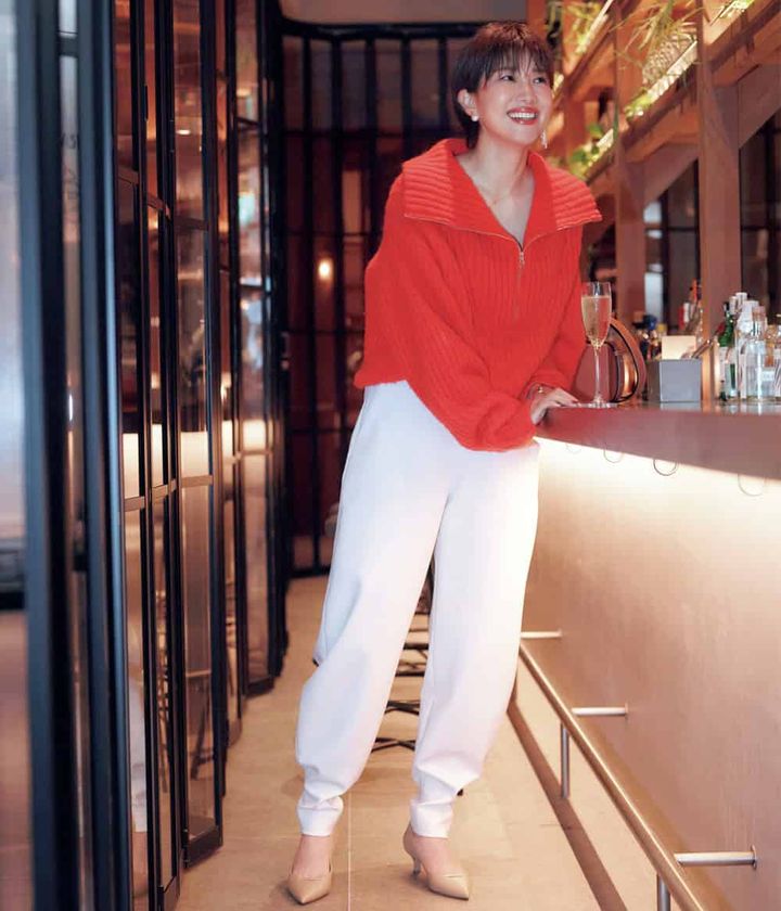 一日中デスクワークの日に頼りたいのは、ストレスフリーなのにきちんと見えるニットパンツは読者にも人気。締め付け感のない柔らかな素材と落ち感のあるシルエットで、長時間座っていても快適さをキープ。スカイブルーの発色が顔まわりを明るく見せ、ワントーンでも地味にならないのが魅力です。