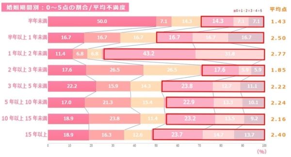 婚姻期間別の平均不満度は以下の通りです。