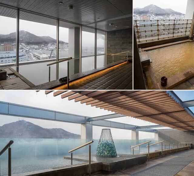 ホテルの最上階、14階にある「天然温泉 スパ ステラ」では、内風呂とサウナに加え、ととのい椅子を並べた露天風呂、さらに階段を上った最上階には船のデッキを思わせる広々とした露天風呂を用意。函館山を望む絶景も見事です。