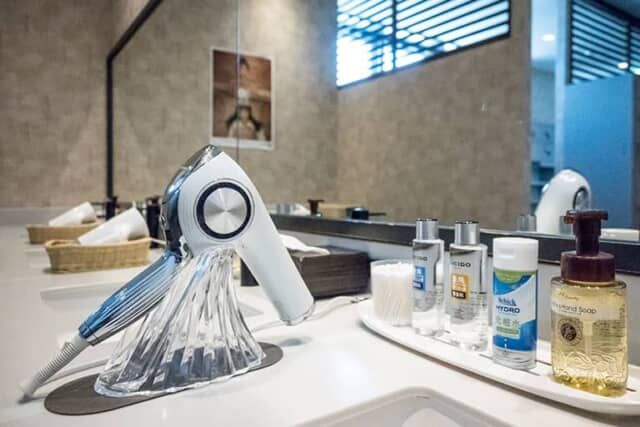 スキンケア用品やアメニティーも用意され、男女ともに数種類のドライヤーが置かれます。今人気のリファのドライヤーもありました。