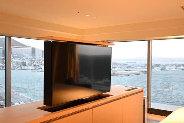 窓に向いたベッドでは、横になって眺望を楽しめるのもこの部屋ならでは。景色を邪魔しないように、収納式のテレビを設置。必要なときに電動で上げてテレビを観られます。