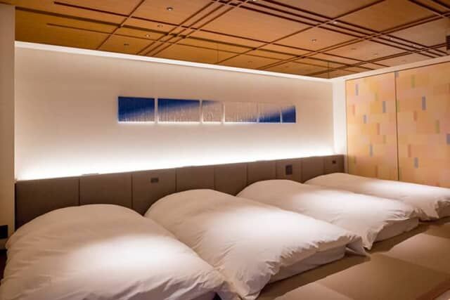 小上がりなった畳スペースには、シモンズと共同開発したがオリジナルマットレスを4台設置(人数により変更)。グループ旅行や家族旅行におすすめの客室です。