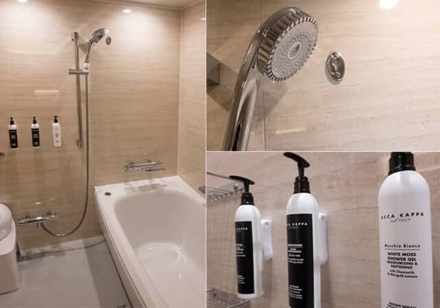 シャワーヘッドは「リファファインバブル ダイア」で、従来よりも1.5倍以上の大きなヘッドのためレインシャワーのように湯量が多く全身で浴びているような感覚です。さらにレジデンスフロアの客室には、150年を超えるイタリアのオーガニックブランド「アッパカッパ」のシャンプー類をそろえます。