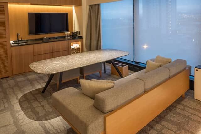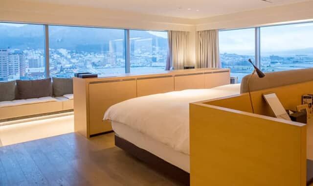 87平米の「ロイヤルスイート」は13階にあるコーナールームで、窓が広く函館山や金森赤レンガ倉庫、函館湾の景色を一望できる客室です。特に2024年に大ヒットを記録したアニメ映画にも登場。シモンズとコラボしたオリジナルベッドは幅160cm × 長さ203cm が2台置かれ定員は2名です。