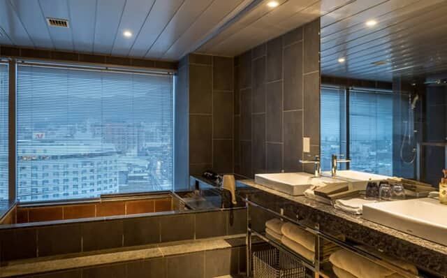 洗面はダブルベイシンを採用。大きな窓からは景色を楽しめるビューバスを設置します。湯船に浸かりながら函館屈指の景色を楽しめるゴージャスさ。茶褐色の温泉がそそがれるのも、特別感を味わえます。※一般客室は温泉ではありません。