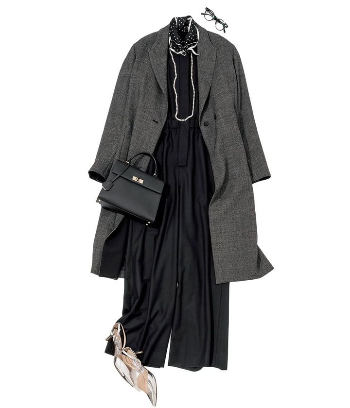 オールインワン¥77,000(コラム/エストネーション)コート¥187,000(サヴィル サヴィ)バッグ¥253,000(ボナベンチュラ)パンプス¥66,000(ネブローニ)スカーフ¥16,500(マニプリ)メガネ¥42,900(プロポ/プロポデザイン)ネックレス¥7,150(アビステ)