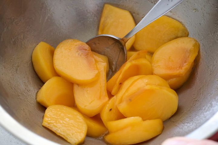 1.かぶは葉を1センチほど残して切り落とし、皮をむいて厚さ7ミリほどのくし切りにする。柿は四つ割りにして皮をむき、厚さ7ミリほどのくし切りにする。