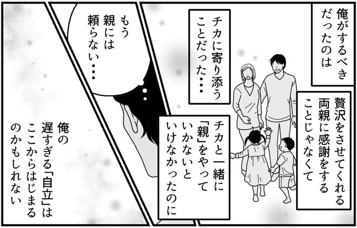 壊れてしまったかのような母さんを目の当たりにして、そんな母さんでも大切にしている父さんを見て、間違っていたのは自分だったということに気が付いた。両親のせいで離婚になったんじゃない。俺自身が不甲斐なかったせいなのだろう。今の俺にできることと言えば、せいぜい子どもたちのために養育費を渡すことくらいだ。次回の面会のときに、チカにはあらためて謝りたいと思っている。