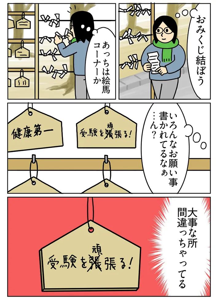 この絵馬に文字を書いた受験生が誤字をした瞬間の、「あ、やっちゃった…」という顔を、つい想像してしまうでしょう。