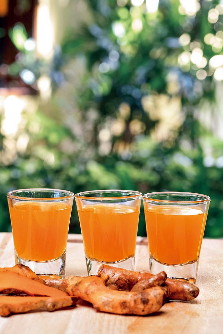 ショウガとウコンで作られた“ジャムゥ ターメリック エリキシール ショット”は朝食の前に。施設内の「ソーマレストラン」ではオーガニック食材に加え、ハーブやスパイスがたっぷりと使われている。 写真提供=Kamalaya Koh Samui