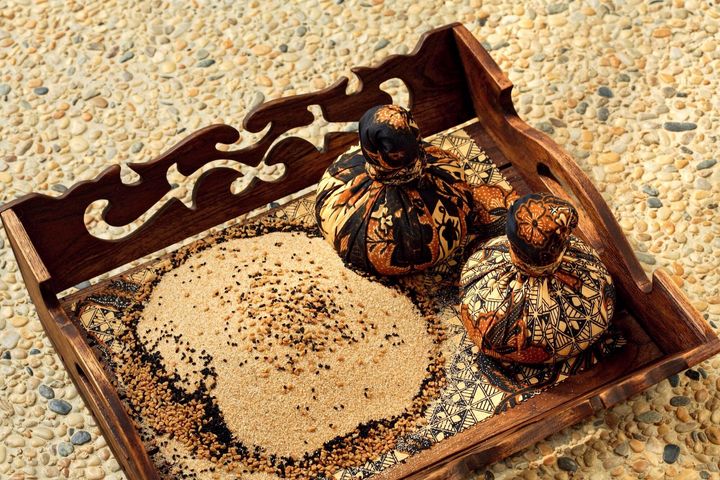 温めたビーチの砂に、古来より健康を助けるといわれているフェヌグリークとブラックシードを加熱して加え、布に包んで押し当ててマッサージする「ヒーテッド・シーサンド・セラピー」。独自にブレンドしたオイルを塗って行う。 写真提供=Tanjong Jara Resort