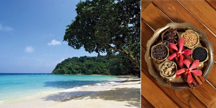 〈左〉ホテルの目の前に広がる、黄金色の砂が輝くプライベートビーチ。緩やかなカーブを描く三日月形で、プライバシーが保たれていて、とても静か。<br>〈右〉施術のベースにあるのはマラッカ王国時代、アラブ、インド、中国の文化が影響し発展したマレー伝統療法。各地域に由来するスパイスが使われる。 写真提供=Tanjong Jara Resort