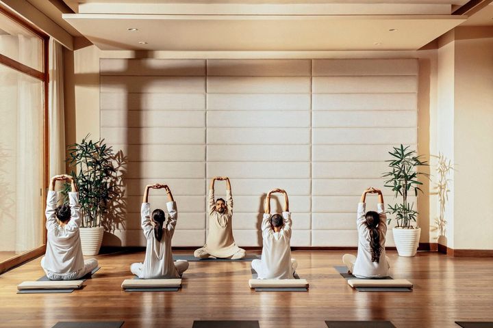 ヨガと瞑想のために作られた場所、「ヨガサラ」でモーニングヨガ。ここでは朝と昼、夕方にレッスンが行われている。ブッダが悟りを開いたとされる菩提樹の挿し木の下で行われるレッスンもある。 写真提供=Six Senses Vana