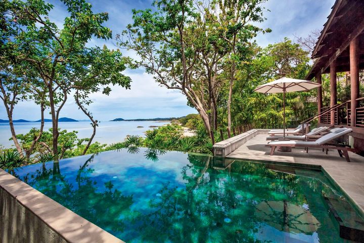 海に面した小高い丘の斜面にあるリゾート。眼下にエメラルド色の海が広がる。プライベートプールと広いベランダをもつ贅沢な「ビーチフロントプールヴィラ」。(1室1泊 21,600THB~/税・サ別) 写真提供=Kamalaya Koh Samui