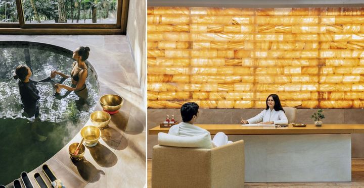 〈左〉水による浮遊感のなか、マッサージとストレッチを行うワッツプール。シンギング・リンの響きに包まれ、地上の重力とともに、心を占めるさまざまな重圧から解き放たれていくような感覚はまさに至福。<br>〈右〉コンサルテーションで悩みや希望を相談。ドーシャのバランスを測る脈診と、30種類のバイオマーカースクリーニングに基づいて、ドクターが滞在中のプランを作り上げる。 写真提供=Six Senses Vana