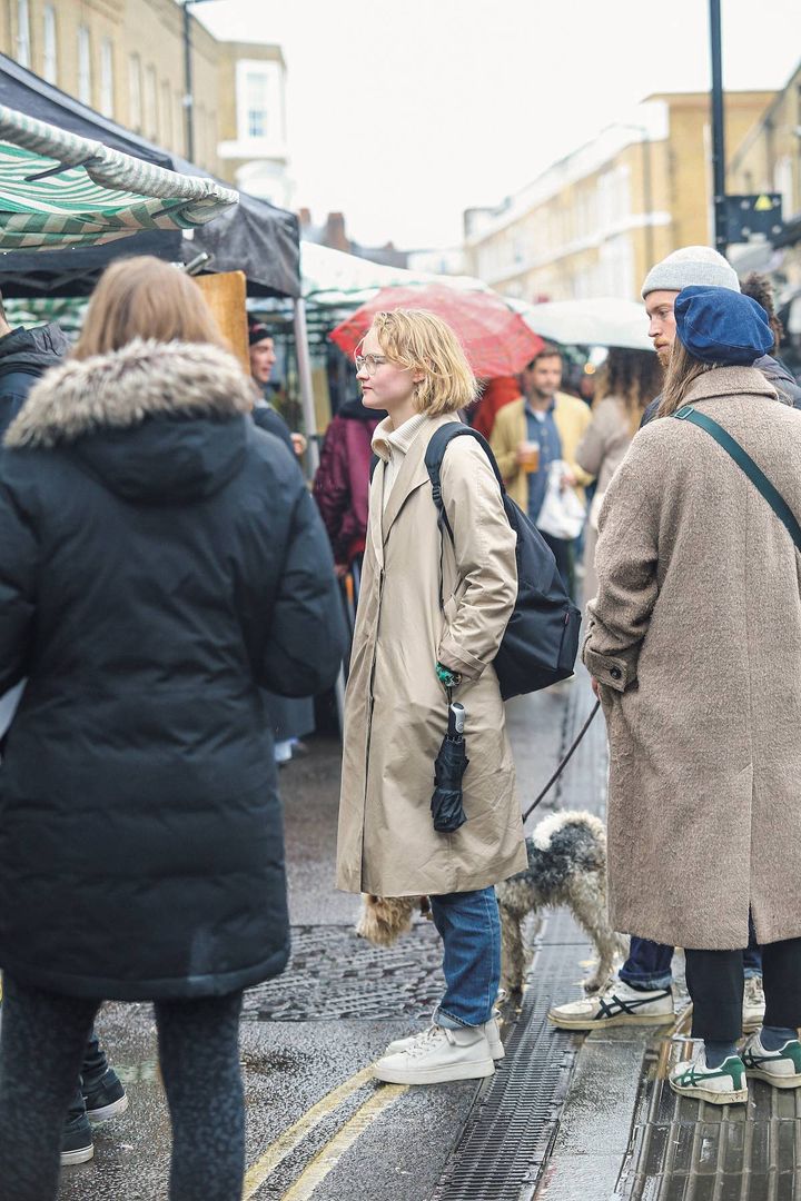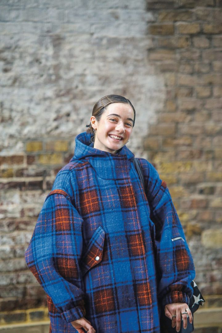 お洒落なロンドナーの中で絶賛流行中の《ワイエムシー》のコートが主役。色鮮やかなチェック柄と屈託のないメイジーの笑顔が、シックなロンドンの街を明るく彩る。