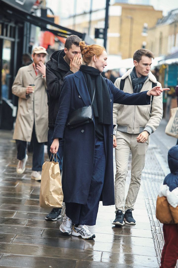 コート/Vintage、セーター/VintageのBlacky Dress、デニムパンツ/StudioNicholson、マフラー、バッグ/ともにCOS、スニーカー/ASICS