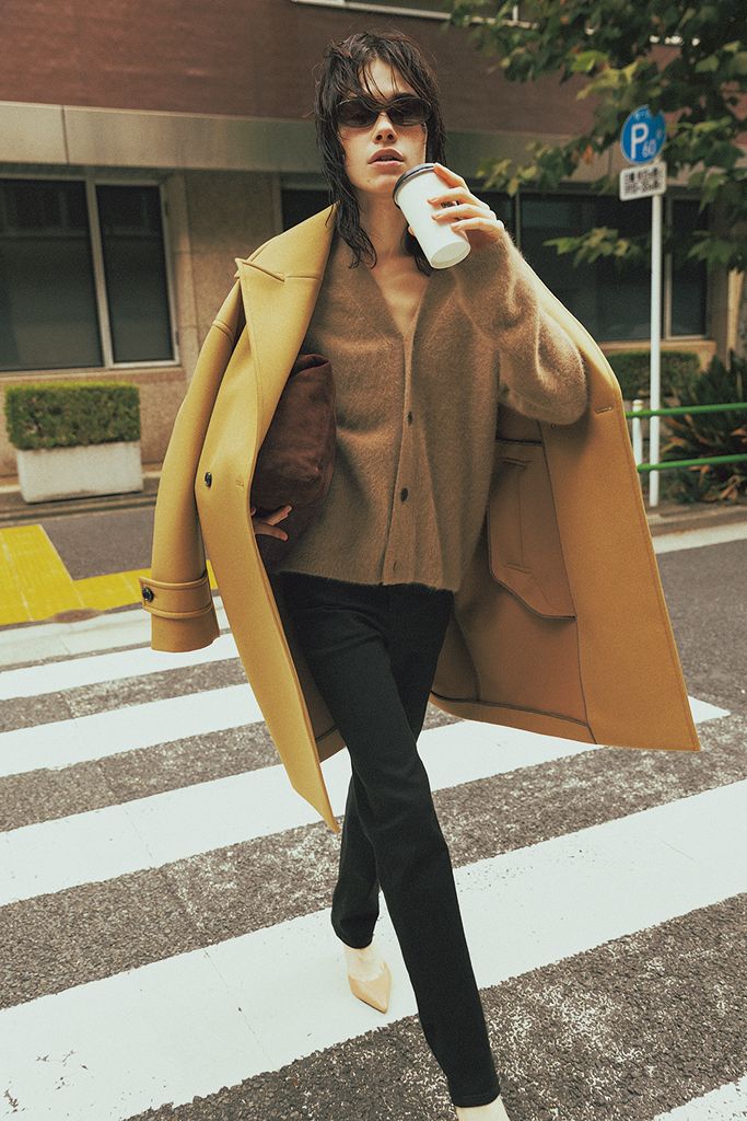 ベージュニットカーディガン/Edition(エディション 表参道ヒルズ店) 黒ストレートデニムパンツ/Levi’s®(リーバイ・ストラウス ジャパン) ベージュジャケット/バビロン(バビロン新宿) サングラス/DMY STUDIOS(ザ・ウォール ショールーム) バッグ/ラシット(ラシット京王百貨店新宿店) パンプス/コルコバード(フィルム)