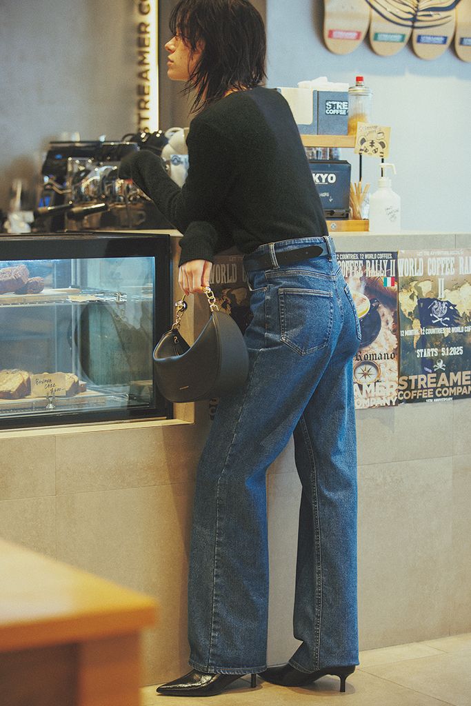 脚にはりつかず肉感をそぎ落とせる、タイト手前のほどよいゆとり。色ムラがないことでキレ味が増すため、糖度の高いベージュのシャギーニットを大人っぽくとり込める。飾り気のないクールな黒デニムなら、ゆるふわニットとでも大人っぽく。