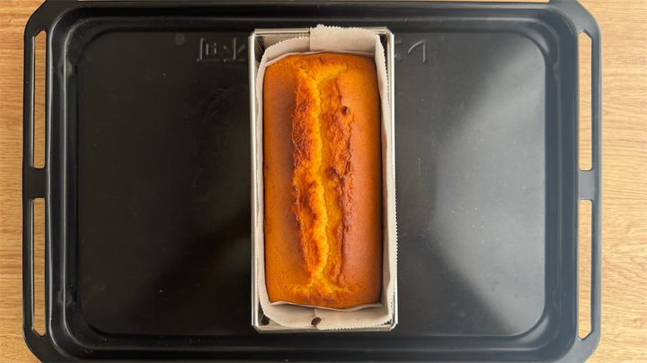 4. 焼き上がったら型ごと台の上に落として蒸気を抜き、型から取り出して冷ます。型紙を剥がして網の上で冷ます。