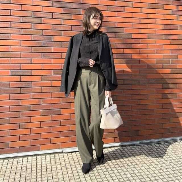 テーラードジャケットのインナーを上下ワントーンでまとめると、洗練感漂うこなれスタイルが楽しめます。例えばブラックのワントーンでまとめれば、ジャケットのクールな印象と相まってハンサムなコーデが完成!