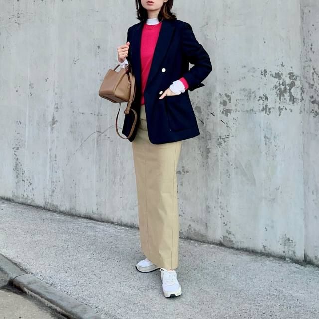 テーラードジャケットにスカートを合わせるのもおしゃれで素敵ですよね。40代の方には、タイトスカートとすっきりまとめるスタイリングがおすすめですよ。ジャケットとタイトシルエットがエレガントなので、あえてスニーカーでカジュアルダウンすると、より大人の余裕を感じるスタイリングに。