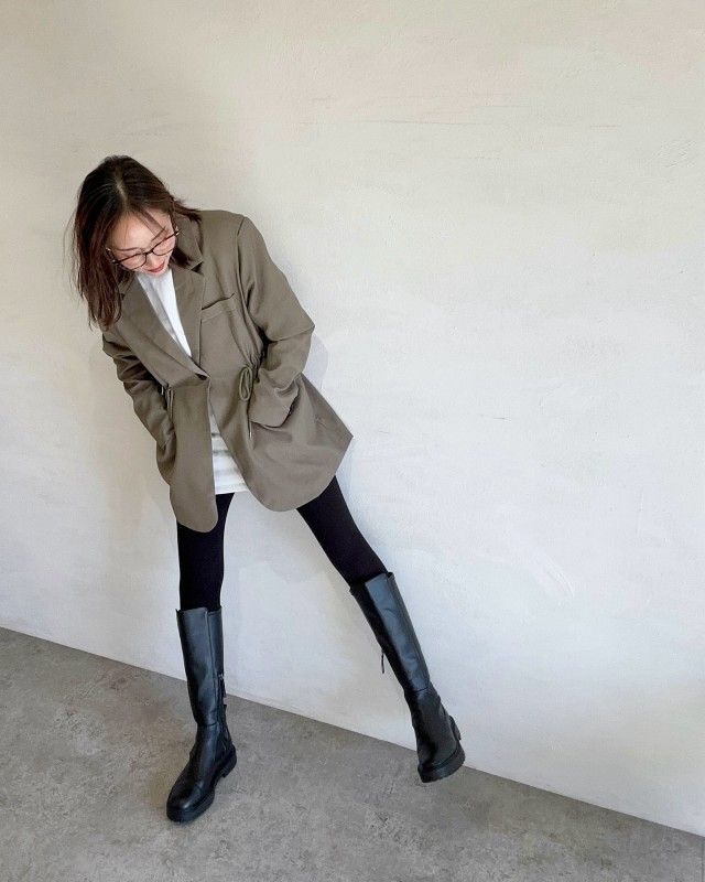 ミニ丈の素肌感が気になる方は、タイツやスキニーパンツなどを活用しても素敵ですよ。ジャケットとタイトな足元の対比が、おしゃれなこなれ感を作ってくれます。