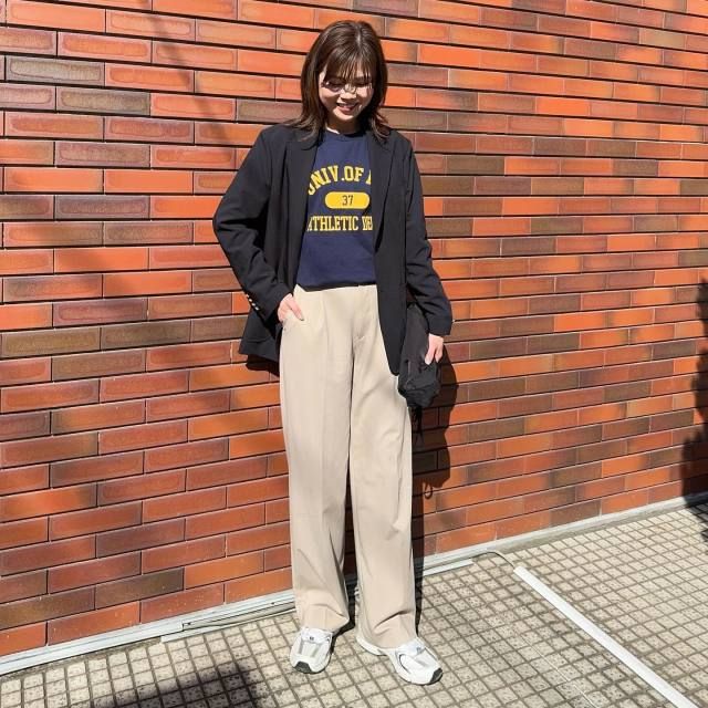ロゴTシャツやスニーカーを合わせれば、ジャケットスタイルのカジュアル度がアップ。カジュアルアイテムを1~2点投入すると、ぐっと親しみやすいこなれコーデにシフトしますよ。なりたいイメージに合わせて、インナーを替えたり、靴をチェンジしたりしてみてください。
