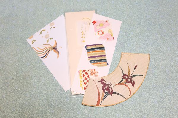 ミュージアムグッズは、ポスターのビジュアルにも使われている《縫箔 紅浅葱段枝垂桜尾長鳥模様(ぬいはく べにあさぎだんしだれざくらおながどりもよう)》(日本・江戸時代 18世紀)の尾長鳥の意匠のポストカード(100円)、《青海波に扇面散模様縫箔(部分)》の扇型の変形ポストカード(150円)、ふみか京小袖(825円)を購入。 小袖の形をした薄い匂い香のふみか京小袖は、手紙に添えたり名刺入れなど懐中に差し入れたりて香りを楽しむことが出来ます。
