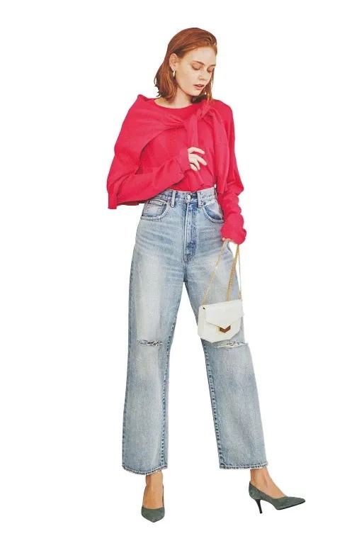 キレイ色も映える、淡い色落ちとゆるすぎない直線美。色落ち&ダメージも、ゆるすぎない直線シルエットやハイウエストによって女性らしく穿けるデニム。股上も深めなのでヒップまわりを締めつけず自然に脚長バランスを演出。 ダメージデニムパンツ「HW CRASH LOOSE STRAIGHT」 /MOUSSY