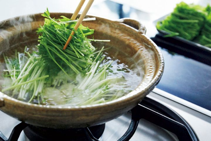 鍋に〈鍋つゆ〉 の材料を入れて混ぜ、たらを加えて中火にかける。煮立ったら鍋の縁を囲うように水菜を入れる。大根おろしをかるく水けをきって中心に加え、おろしが温まったら煮汁ごといただく。