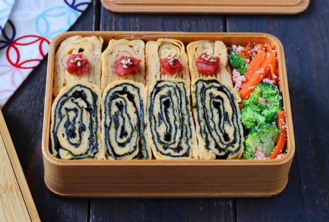 卵2個を使ってたっぷり卵焼きを作ります。中央に海苔を置き、カットすると海苔巻き卵と通常の卵焼きの2種類ができますよ。
