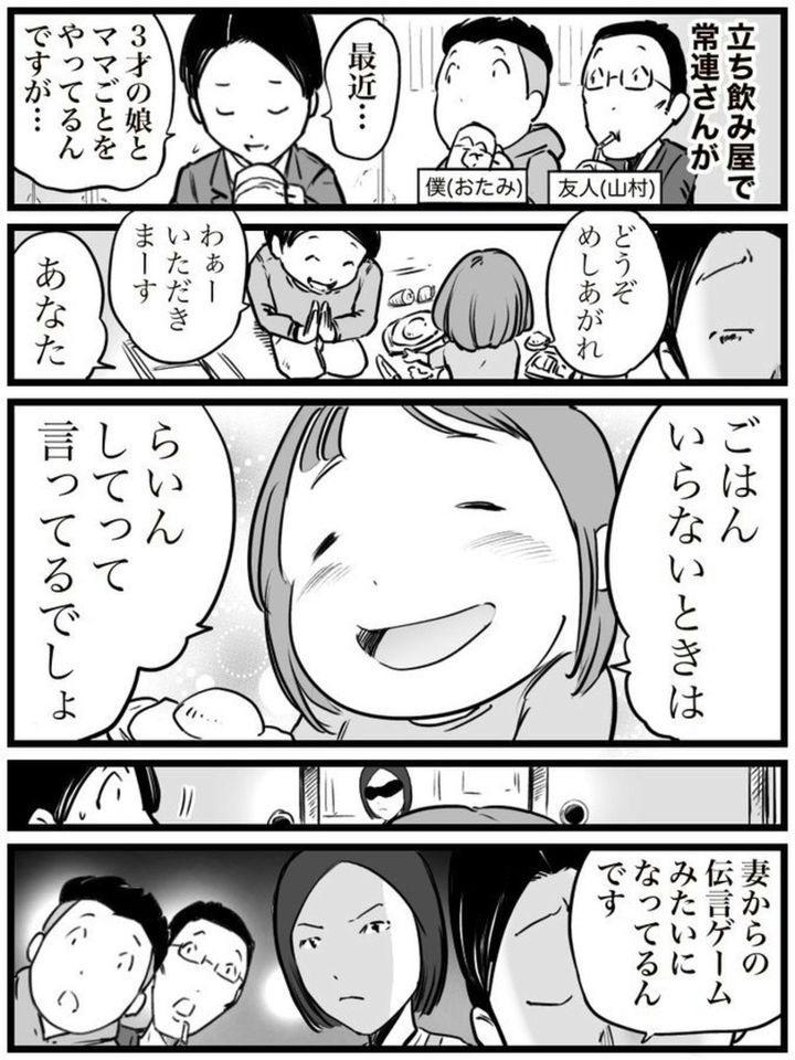 漫画『ド真面目な友達がキャバ嬢にハマった話』の著者・おたみ(@otamiotanomi)さんは、ある日の立ち飲み屋にて常連客から、3歳の娘さんとのエピソードを聞かされました。おままごと中の娘さんの言葉に、思わず考えさせられることに…?