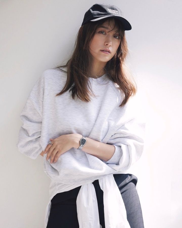 ウォッチ『セルぺンティ セドゥットーリ』〈SS、DIA〉¥1,573,000リング¥408,100(ともにブルガリ/ブルガリ・ジャパン)スウェットトップス¥23,100(RHC/RHC ロンハーマン)パンツ¥44,000(イウエン マトフ/ユナイテッドアローズ 渋谷スクランブルスクエア店)腰に巻いたシャツ¥30,800(スローン/ザ ショップ スローン 新静岡セノバ店)キャップ¥12,100(ザ ニュー ソサエティ/サードマガジン)