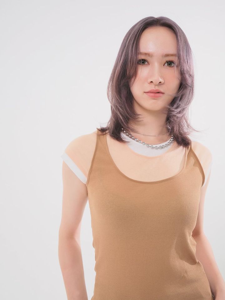 顔まわりを中心にレイヤーをたっぷり入れた大人カッコいいミディアムには、透明感あふれる、ほのかに色を感じる程度のさりげない寒色系カラーをマッチング。ブリーチ1回後、ラベンダーアッシュをワンメイクでカラー。肌のツヤ感と明るさが引き立ち、ストリートモードなおしゃガールに。