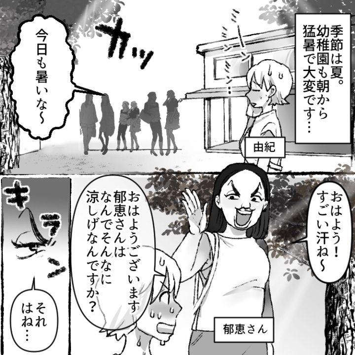 1児のママの由紀は、同じ幼稚園に通うドラマ大好きママ・郁恵さんと今日も他愛もない話をしていた。そこに、ママ友の前田さんがやってくる。前田さんは上の子が小1のため、今年が初めての夏休み。せっかくの機会だからと、あれこれ予定を立てているようで、張り切っている様子の前田さん。しかし、郁恵さんは、予定を詰め込み過ぎて彼女がメンタルを病むのではないかと心配する。明るい前田さんなら大丈夫だろうと思う由紀だったが、なんと後日、前田さんがいきなり園で泣き出してしまうことに!?