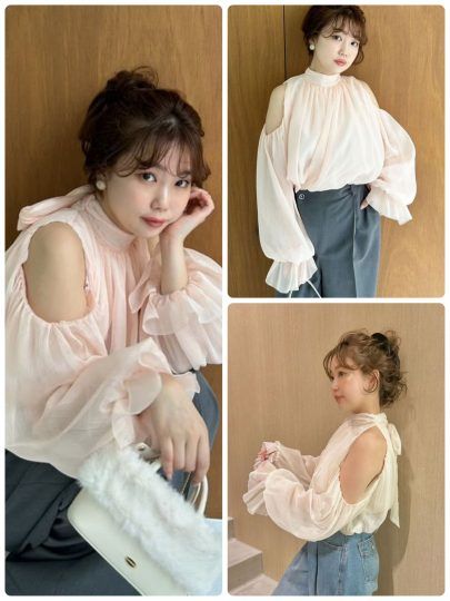 柔らかで女性らしい雰囲気を放つシフォン仕立てのブラウス。袖にたっぷりとボリュームをもたせたデザインで、二の腕をカバーすると同時に華やかな印象も引き立てます。サイドから見ても腕がすっきりと見えるように、肩の開きをほんのりVラインに仕上げたのもポイント。前後差のあるデザインでインでもアウトでも楽しめます。