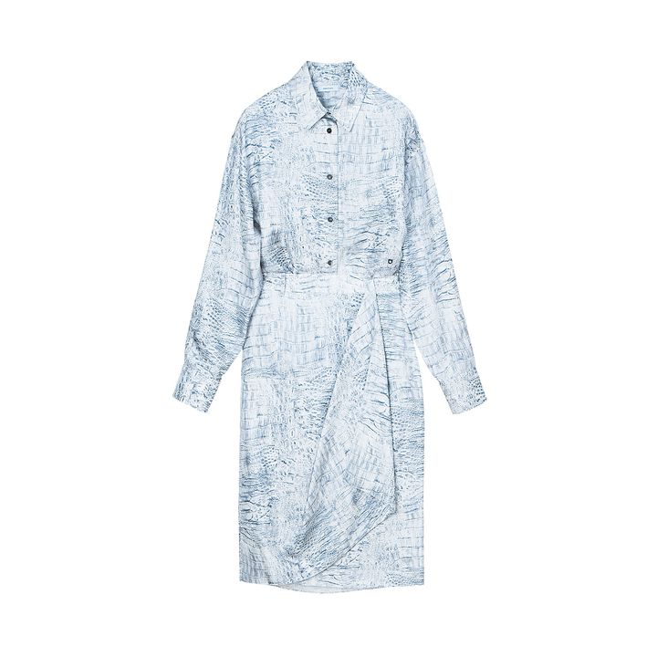 お座敷での会食でも快適に過ごせる、柔らかいシルク素材。淡いグレートーンのなかに、クロコダイルプリントがさりげなく浮かび、しゃれ感とエレガンスを両立します。
