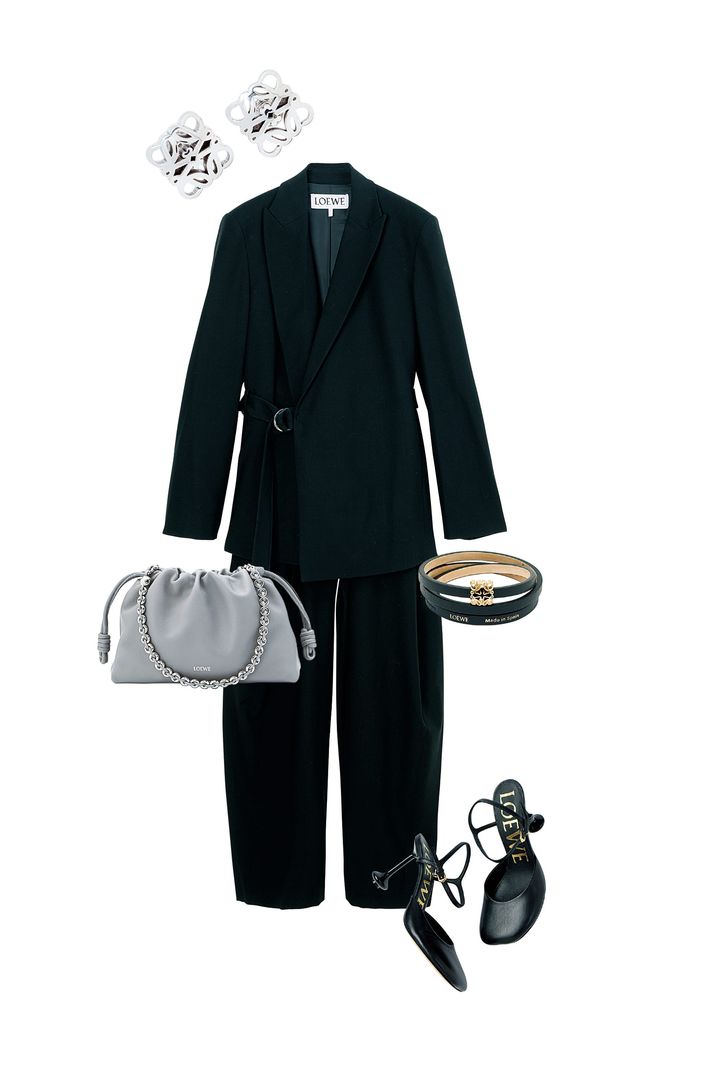 ジャケット¥339,900 パンツ¥196,900 バッグ¥541,200 靴¥162,800 ピアス¥88,000 ブレスレット¥49,500(すべてロエベ/ロエベ ジャパン クライアントサービス)