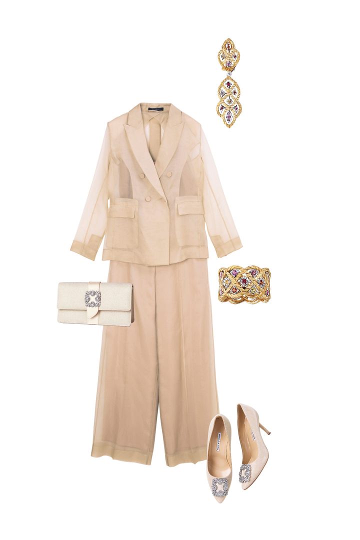ジャケット¥408,100 キャミソール¥95,700 パンツ¥221,100(すべてマックスマーラ/マックスマーラ ジャパン) バッグ¥335,500 靴¥225,500(2点共マノロ ブラニク/ブルーベル・ジャパン) [YG×WG×スペサルティンガーネット×ルビー×サファイア]ピアス¥1,375,000 リング¥1,210,000(2点共ブチェラッティ)