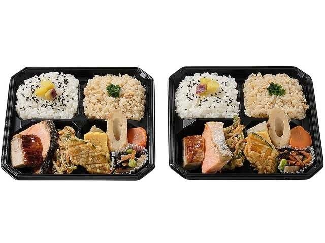 2種類の御飯と銀鮭塩麹焼き鶏照り焼き野菜のかき揚げ煮物などの複数のおかずが楽しめるお弁当です。 カロリー:512kcal 【販売地域】北海道、東北、関東、甲信越、北陸、東海、近畿、鳥取県、島根県、岡山県、広島県、四国、九州