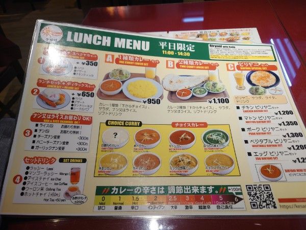 平日限定ランチメニューは11時から14時30まで。 私はAの1種カレーセット(950円)にしました!内容はカレー1種種類をメニュー表チョイスカレーの中から選び、ナンまたはライス、サラダ、ソフトドリンク付き。 選んだのは「チキンカレー、ナン、マンゴーラッシー」を注文しました。