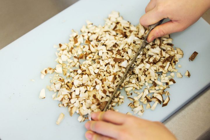 ①タネ作りから。長ネギときのこと生姜は粗みじん切りにし、片栗粉をまぶしておく。