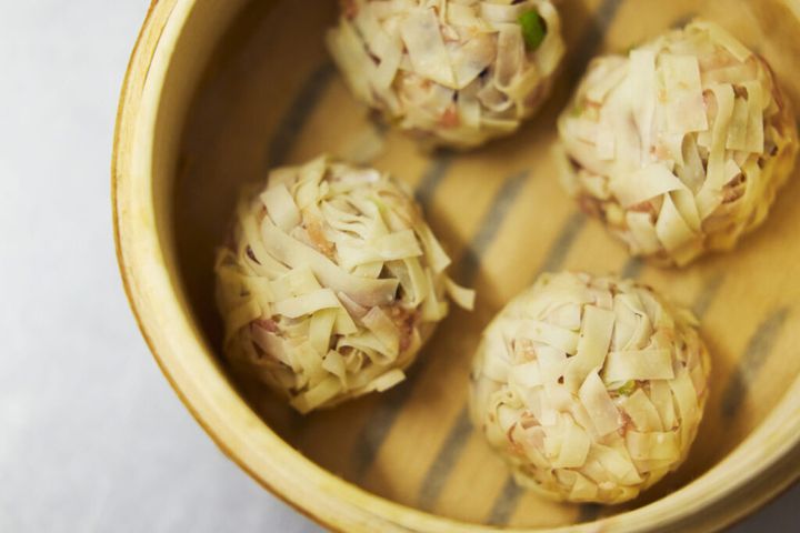 しゅうまいの皮はおおよそ正方形かと思うのですが、まずは半分に切ります。長方形になったら、長辺が自分と平行になるようにして置き、垂直方向に幅5ミリくらいの大きさで切り揃えていきます。細長くなった皮をタネにまぶせば、包む作業は終了。しゅうまいを作るのが苦手な方も、これなら気軽にできますよね。クッキングシートを敷いた蒸し器に並べて、15分蒸したら完成です。