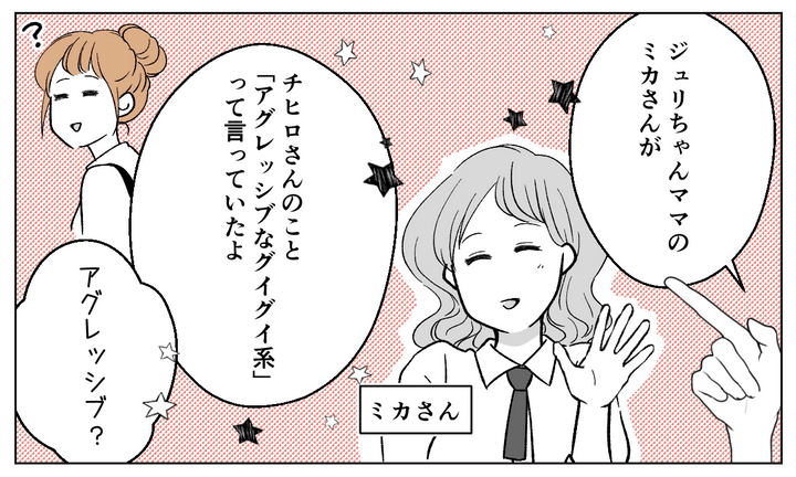 ユウコいわく、ジュリちゃんママのミカさんが、チヒロさんのことを「アグレッシブなグイグイ系」だと言っていたとのこと。すぐにはピンと来なかったのですが、その後の話を聞いて深く納得することになります……。