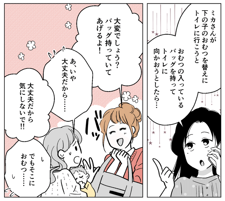私はハル(32)。娘のカリン(小1)とアイ(2)を育てています。今日はララちゃん親子、ジュリちゃん親子、ミユキちゃん親子との4組で公園へ遊びに行きました。お昼のお弁当を食べ終わると「ゴミを捨ててあげるね」と言って、ミユキちゃんのママのチヒロさんは私たちのお弁当箱を勝手にあけてゴミを捨てたのですが、そのときに中に入っていたピックも捨てられてしまったのです。「なんで余計なことをするの!」という怒りを、一番親しいママ友のユウコに聞いてもらっています。